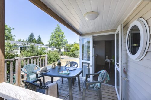 Deze gelijkvloerse cottage voor 5 personen heeft een woonkamer met zithoek. In de open keuken vind je onder andere een magnetron en een koffiezetapparaat. Er zijn 3 slaapkamers, waarvan 1 met een tweepersoonsbed, 1 met 2 eenpersoonsbedden en 1 met 1 eenpersoonsbed. De badkamer beschikt over een douche en er is 1 apart toilet. De cottage heeft verder een overdekte veranda met tuinmeubilair en 2 zonneligbedden. Parkeren kan op de centrale parkeerplaats.