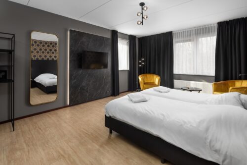 Deze 4-persoons hotelkamer heeft een hoekligging. De kamer beschikt over 4 eenpersoonsboxspringbedden, waarvan 2 in een aparte slaapkamer. De kamer is voorzien van een badkamer met douche en er is een apart toilet. Er is een kluisje en een televisie en er zijn koffie- en theefaciliteiten aanwezig. Het gebruik van wifi is gratis. Je kunt met voorkeur reserveren voor een terras en airconditioning, hier zijn voorkeurskosten aan verbonden.