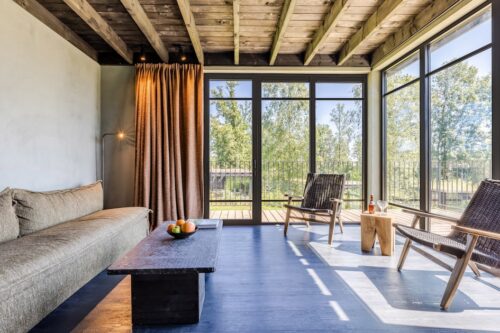 Deze ruime, vrijstaande lodge is geschikt voor 4 personen en heeft aanpassingen voor mindervaliden. De knusse woonkamer heeft grote ramen. Vanaf de bank geniet je van het schitterende uitzicht op de natuur of kijk je jouw favoriete programma op tv. De aangepaste, open keuken is van alle gemakken voorzien. Hier vind je onder andere een koelkast met vriesvak, een magnetron, een oven, een vaatwasser, een koffiecupapparaat en een waterkoker. De lodge heeft 2 slaapkamers met elk 2 eenpersoonsbedden. Beide slaapkamers hebben een aangrenzende badkamer met een wastafel en een regendouche. Een van de badkamers heeft ook een toilet. De lodge heeft daarnaast 1 apart toilet. De schuifpui in de woonkamer geeft toegang tot het terras met tuinmeubilair. In de buurt van de lodge is ruimte om de auto te parkeren. Tijdens je verblijf maak je gratis gebruik van wifi. De temperatuur in de lodge kun je met behulp van de warmtepomp regelen.