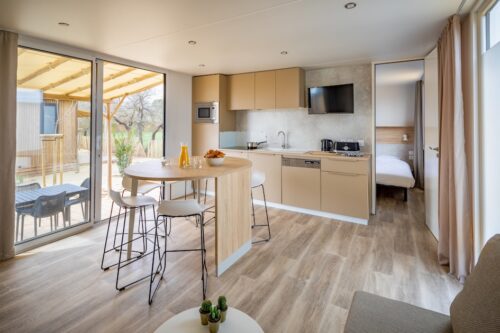Dit nieuwe, vrijstaande chalet is geschikt voor 5 personen. De ruime, gezellige woonkamer is ingericht met een zithoek met televisie en een eethoek. De open keuken is ingericht met onder andere een koelkast met vriesvak, een koffiecupapparaat, een magnetron, een waterkoker en een vaatwasser. Het chalet heeft 2 slaapkamers. Er is 1 slaapkamer met 1 tweepersoonsbed van 160 x 210 cm, een televisie en een aangrenzende badkamer. De badkamer is ingericht met een douche, een toilet en een wastafel. De andere slaapkamer is ingericht met 1 eenpersoonsbed van 80 x 200 cm en 1 stapelbed met matrassen van 80 x 200 cm. Ook deze slaapkamer heeft een aangrenzende badkamer. Deze is ingericht met een douche en een wastafel. Er is ook apart toilet. Buiten is er een terras met tuinmeubilair. Het vakantieverblijf is voorzien van gratis wifi en airconditioning. Zo geniet je ook tijdens warme zomerdagen van koele nachten. Parkeren kan in de buurt van het chalet.