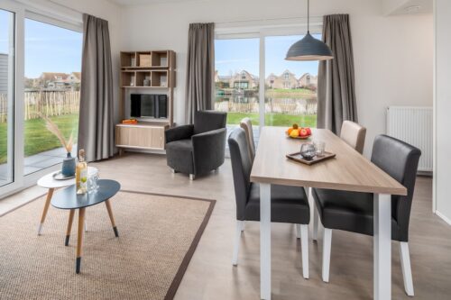 Deze vrijstaande en gelijkvloerse lodge is geschikt voor 4 personen. In de woonkamer vind je een zithoek met smart-tv. De keuken is uitgerust met een vaatwasser, waterkoker, combimagnetron en koel-vriescombinatie. De lodge heeft 2 slaapkamers met boxspringbedden. Daarnaast is er een badkamer met douche en in de hal bevindt zich een apart toilet. Ook is er een tuin met meubilair. Je kunt gratis gebruikmaken van wifi en er is parkeergelegenheid voor één auto bij de lodge.