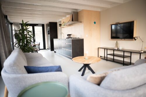 Deze vrijstaande lodge is geschikt voor 8 personen. In de woonkamer is een zithoek en eethoek. De keuken heeft een vaatwasser, koelkast met vriesvak, combimagnetron, koffiecupmachine en een kraan voor kokend water. Boven zijn er 4 slaapkamers, 2 met eenpersoonsbedden en 2 met stapelbed. Er zijn 2 badkamers met een wastafel en douche. Beneden is een apart toilet. De lodge heeft een tuin met veranda en ligstoelen. De hele lodge heeft vloerverwarming en gratis wifi. Er is plek voor 1 auto op de centrale parkeerplaats. Voor eventuele extra auto’s is er in de directe omgeving van het park voldoende parkeergelegenheid (tegen betaling).