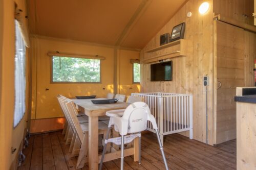 Safaritent geschikt voor maximaal 5 volwassen en 1 kind. Deze ruime en sterke canvastent is voorzien van houten binnenwanden en een houten vloer. In totaal zijn er 3 slaapcabines. De grootste slaapcabine is ingericht met een tweepersoonsbed met 2 eenpersoonsmatrassen. Er is 1 slaapcabine met een stapelbed en 1 eenpersoonsbed. Daarnaast is er een slaapcabine met een kinderledikant, een commode en een kinderbadje. Er is een volledig ingerichte badkamer met toilet en douche aanwezig. De open keuken is voorzien van een koelkast met intern vriesvak, waterkoker, gasfornuis en koffiepadapparaat. In de zithoek vind je een tv, elektrische kachel en kinderstoel. Ook beschikt de safaritent over een picknicktafel en een loungeset naast de tent. Je kunt gratis gebruikmaken van wifi en er is ruimte voor 1 auto op de centrale parkeerplaats.