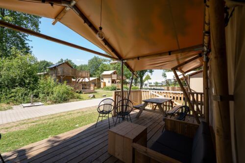 Deze stoere canvastent is geschikt voor 8 personen. De safaritent is voorzien van houten binnenwanden en een houten vloer. Er is een zithoek met televisie, een eethoek en een keuken met een koelkast met vriesvak en een gasfornuis. De tent heeft 3 slaapcabines, 1 met een tweepersoonsbed, 1 met 2 stapelbedden en een bedstee. Ook is er een badkamer met toilet, wastafel en douche aanwezig. De tent heeft een veranda met een picknicktafel en een loungeset. Je maakt gratis gebruik van wifi.