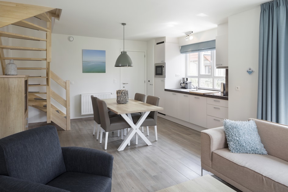 Lees meerDeze gelijkvloerse cottage voor 4 volwassenen en 1 kind heeft een woonkamer met zithoek en televisie. In de open keuken…
