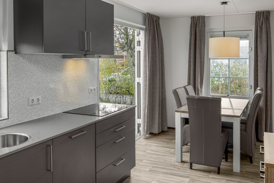 Lees meerBungalow voor 8 personen. In deze bungalow vind je een gezellige woonkamer met zithoek en smart-tv. De open keuken is…
