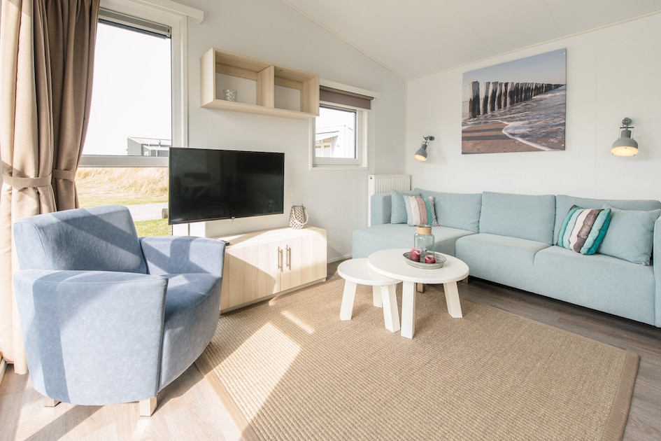 Lees meerLuxe duinlodge voor 4 personen. De woonkamer is sfeervol ingericht met een modern interieur, tv en DVD-speler. De luxe keuken…