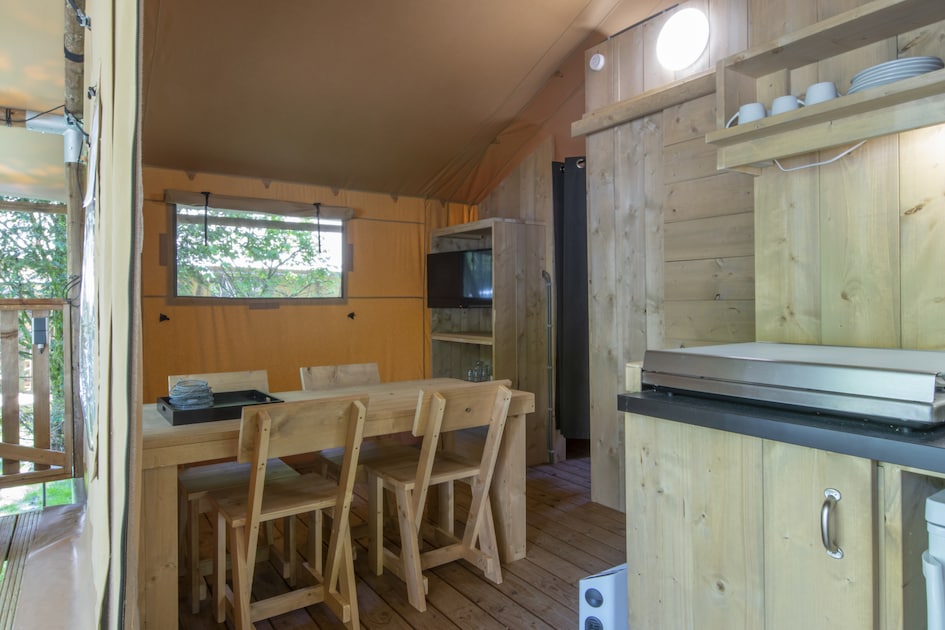 De safaritent is geschikt voor maximaal 4 personen. De open keuken is voorzien van o.a. koelkast, waterkoker, gasfornuis en koffiezetapparaat….