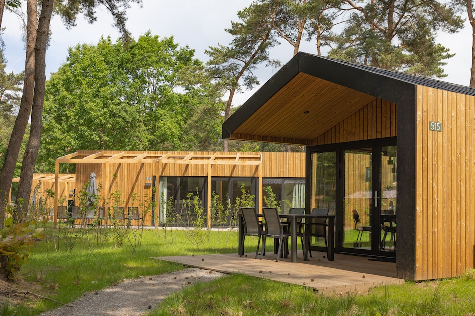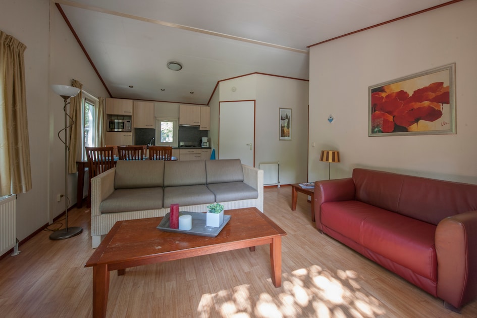 Lees meerDeze vrijstaande lodge is geschikt voor 4 personen. In de woonkamer is een zithoek, eethoek en smart-tv. De keuken heeft…