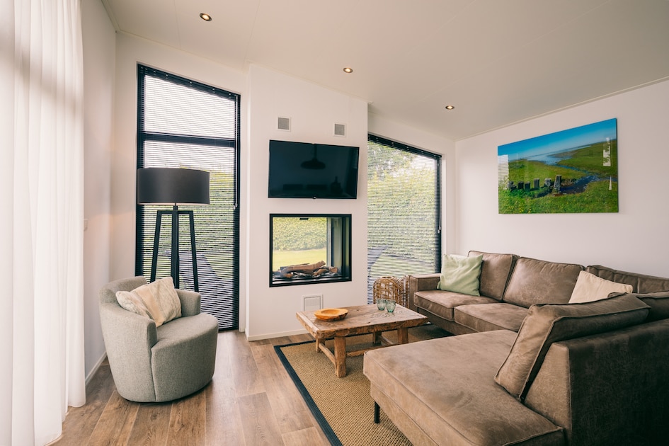 Lees meerDeze vrijstaande wellness bungalow is gelegen aan het water en geschikt voor 8 personen. De ruime woonkamer beschikt over een…