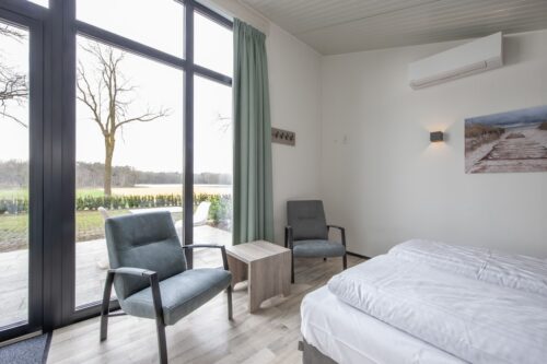 Dit vrijstaande Tiny House is gelijkvloers en geschikt voor 2 personen. Het vakantieverblijf bestaat uit één ruimte met zithoek, smart-tv en eettafel. Er staan 2 eenpersoonsboxspringbedden. In de keuken vind je een vaatwasser, combimagnetron, koffiepadapparaat en koelkast met vriesvak. Er is ook een badkamer met inloopdouche, toilet en wastafel. Bij het Tiny House is een terras en parkeren kan op de centrale parkeerplaats. Je kunt gratis gebruikmaken van wifi.